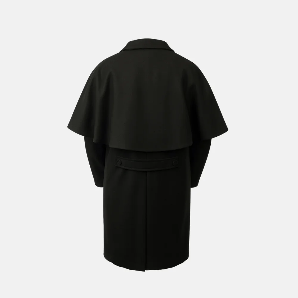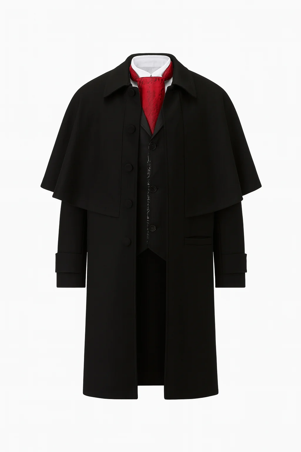 Every detail of the Coburn Great Coat exudes presence. The Victorian-inspired knee-length design drapes elegantly, offering a silhouette that commands respect without trying. Its spread collar frames your posture with confident sharpness, while the capelet detail adds a bold twist — instantly recognizable and effortlessly regal. The smooth button closure secures a structured, tailored fit, sculpting the body for comfort and distinction. Completed with the signature red cravat, this coat channels vintage cinema energy fused with contemporary urban flair — a timeless blend of rebellion and refinement.