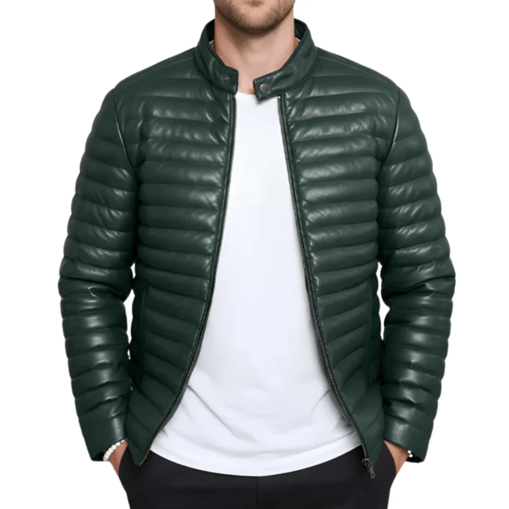Own Every City Moment in Comfort & Edge – Havoc Men’s Green Leather Puffer Jacket for Real-Life Wear