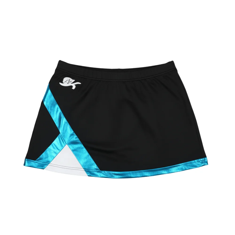 - Performance-grade skirt with asymmetric teal striping for movement and shape